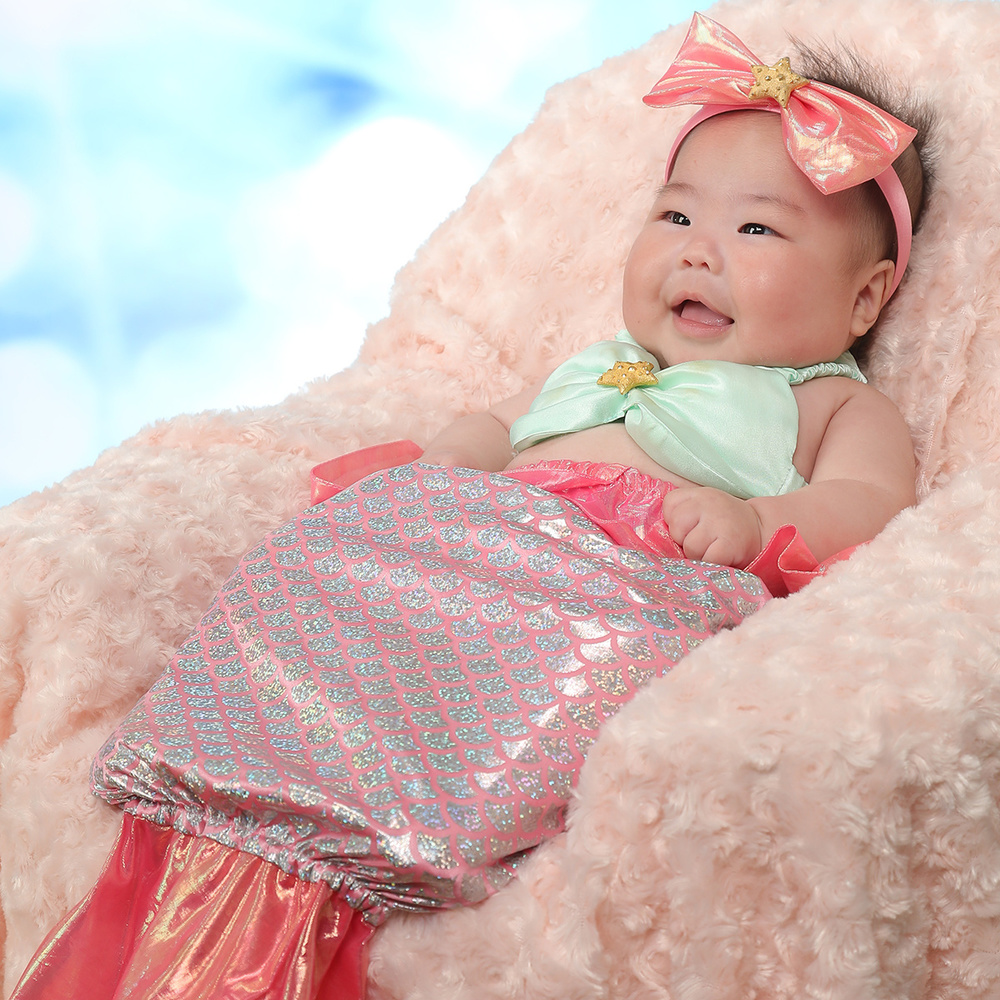 生まれてすぐのニューボーンフォトや初宮参り、100日記念にお食い初め、初節句のお祝いや、6ヶ月を祝うハーフバースデイなど赤ちゃんの撮影は時期を逃さないでね。お初着のほかにもいろんな撮影衣装があるよ。なにを着るかな?
