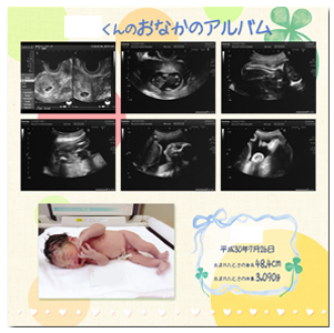 赤ちゃんが生まれるまでのエコー写真と生まれたての写真をセットにしたプリント。生まれたときの身長体重も入るよ。赤ちゃんの記念写真と同じ台紙に貼ることもできます。