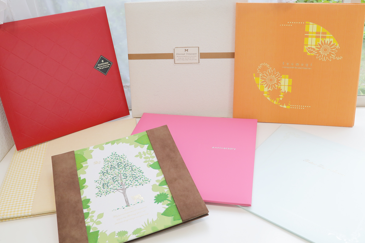 写真を貼るための台紙です。可愛いもの、かっこいいもの、増やしていけるものなどいろいろあります。デザインとページ数により価格が異なります。