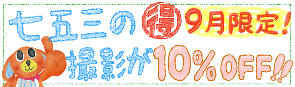 期間中七五三を撮影されたお客様には10%値引きさせていただきます。期間は9月30日まで、この機会をのがさないでね