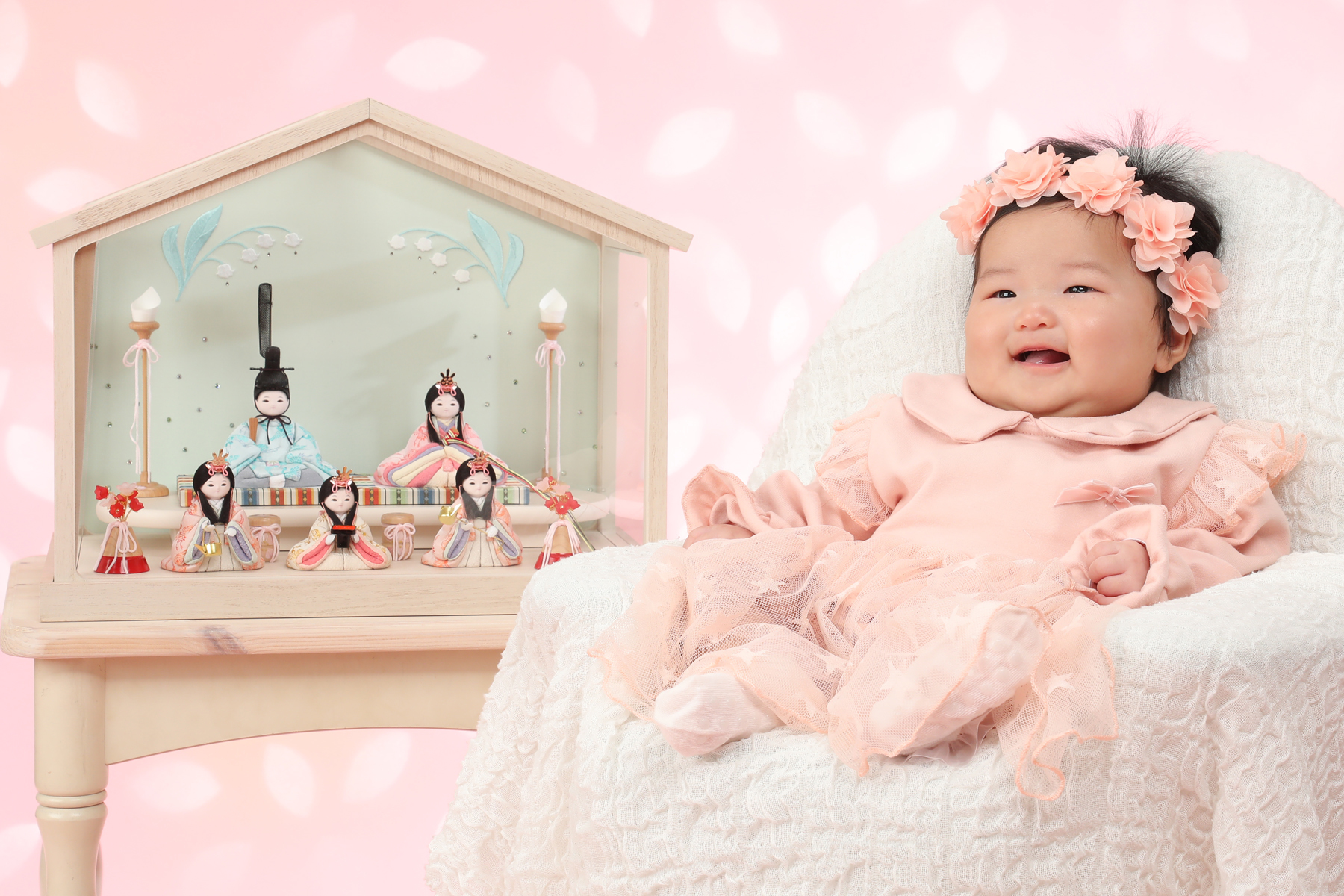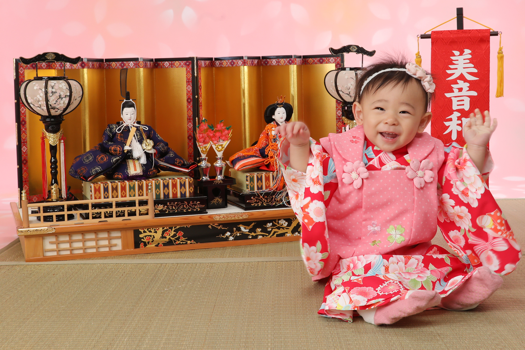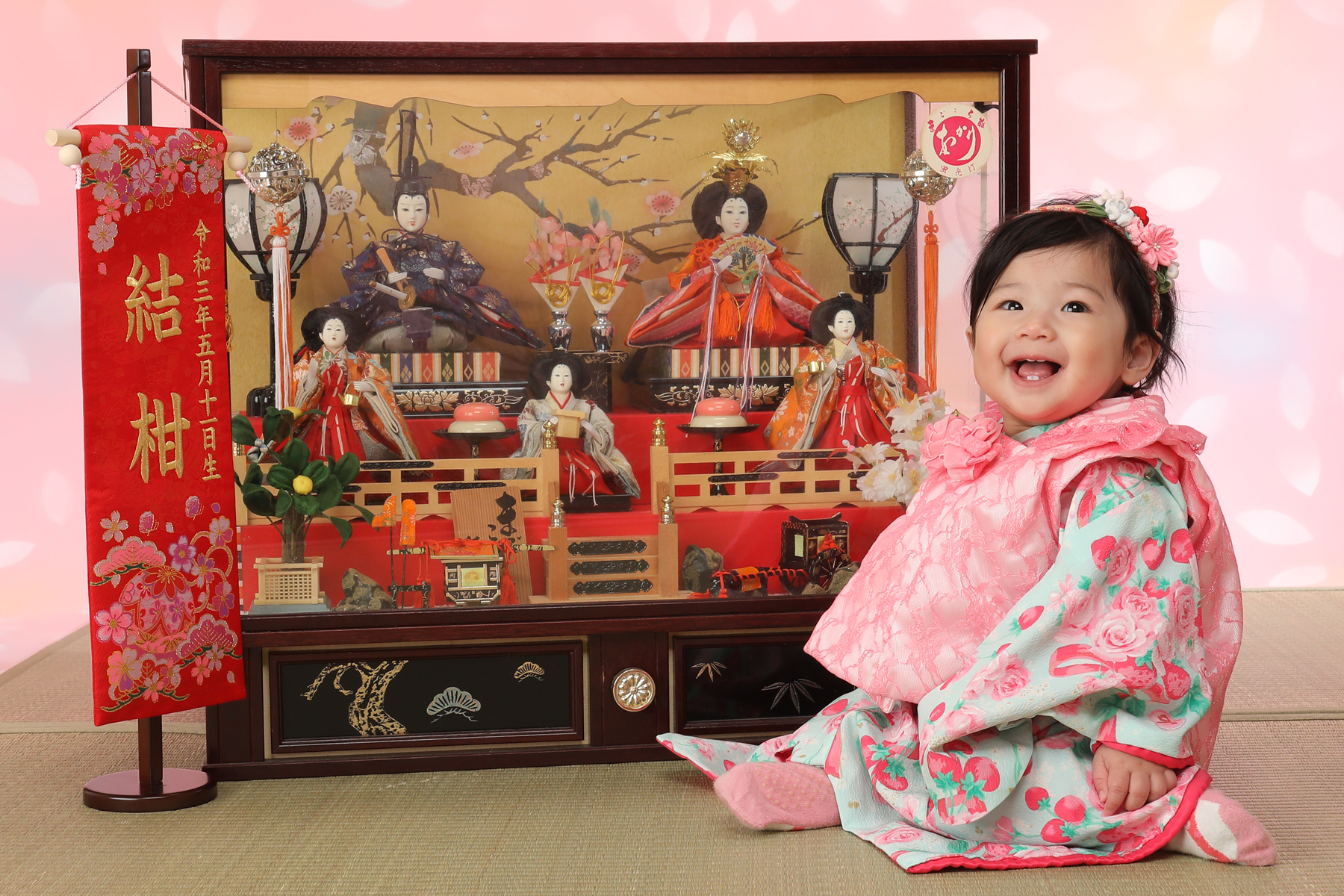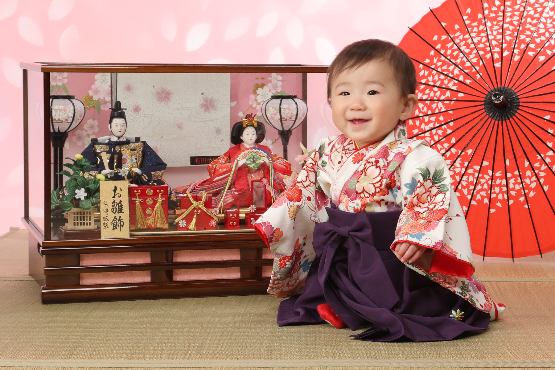 生まれてはじめての3月3日のひな祭りは特に「初節句」としてお祝いをします。その初めてのひな祭りの記念を写してあげてください。自分のおひなさんを持ってきてもらったら一緒に写したりできるのでよかったら持ってきてね。