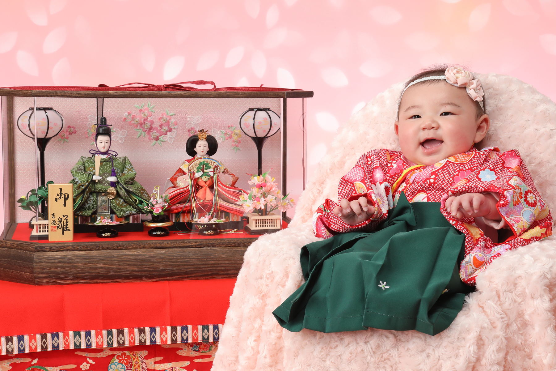 「初節句撮影プラン」をやっています。自分のおひなさんを持って来てもらったら、そばに置いて一緒に写ったり出来るので、よかったら持って来てね。 3月じゃなくてもご都合の良い時にご予約ください。